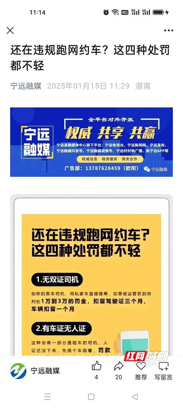 充分利用微信公众号、宁远融媒体等网络、电视媒体,发布《关于严厉大家春运期间导游运输非法经营行为的通告》《安全出行 拒绝黑车 选择安全》等通告,对“网约车”“非法营运”等概念进行宣传,向社会大众普及乘坐“非法营运”车辆出行的危害,引导网约车行业从业者合法合规营运,引导公众乘坐合法营运车辆出行。